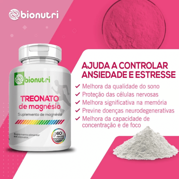 Rápida absorção, Aumenta Imunidade, Melhora no desempenho de aprendizagem, Redução sensível do estresse e da ansiedade, Melhora significativa na capacidade cognitiva, Melhora significativa da memória, tanto a recente como a profunda, Melhora de bom nível na qualidade do sono, Redução da fadiga física e do cansaço mental, Treonato de Magnésio Bionutri O Magnésio é o quarto mineral mais prevalente do corpo humano, sendo de grande importância para diversos processos vitais como contração muscular, formação óssea, metabolismo energético, regulação do humor e do sono e, ainda, como cofator para absorção de nutrientes.